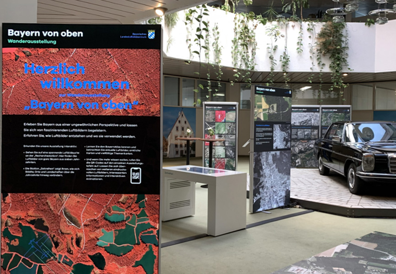 Anlässlich des fünfjährigen Bestehens des Bayerischen Landesluftbildzentrums stellte die Wanderausstellung dessen Angebote einem breiten Publikum vor. Die multimedial gestaltete und leicht verständlich aufbereitete Ausstellung vermittelt einen spannenden Einblick in die Geschichte und Technik der Luftbildfotografie. Auf 14 Ausstellungstafeln wurde den Besucherinnen und Besuchern gezeigt, wie Luftbilder gemacht werden, wie sie aufbereitet werden und wo sie eingesetzt werden.